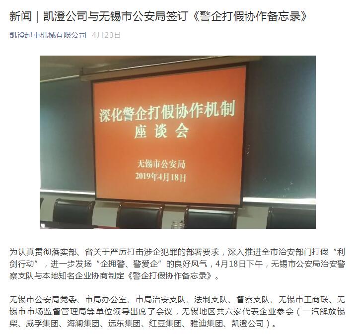 2019-04 凯澄公司与无锡市公安局签订《警企打假协作备忘录》